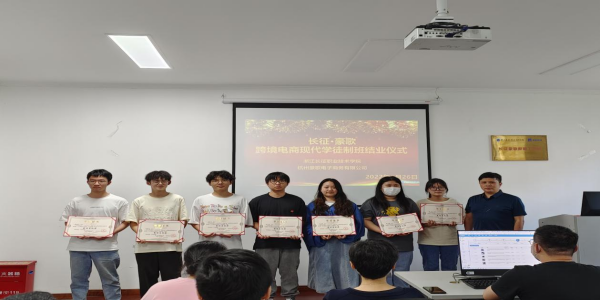 近日,商务与贸易学院和杭州豪歌电子商务有限公司(以下简称杭州豪歌)联合举办的首届长征·豪歌跨境电商现代学徒班结业仪式在实训楼室南110室顺利举行。商务与贸易学院院长王珍、副院长陈露,杭州豪歌总经理王建豪、副总经理许新、运营总监金开,全体跨境电商教研室教师及学徒班学生参加了结业仪式。