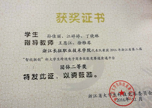 12月23日,贸易系进出口业务训练营的3名跨境电商创业团队成员在国贸专业教师的带领下参加2016“智欣联创”杯浙江省高职高专院校跨境电子商务技能竞赛的总决赛,荣获团体组“二等奖”的佳绩。
