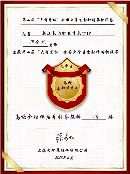 指导老师蒋金龙在本次比赛中荣获高校金融操盘手指导教师二等奖