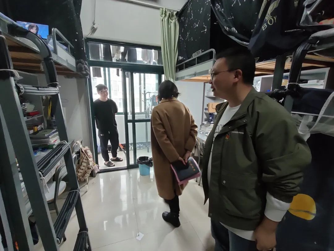在走访的过程中,老师们和同学们进行亲切的交谈,认真听取同学们对于学校教学、管理和服务等方面的意见建议,了解同学们的学习情况、生活近况及遇到的困难,鼓励同学们明确目标,脚踏实地,好好学习,提醒大家要保持寝室干净整洁,营造一个文明、和谐的寝室氛围,同时要注意宿舍的安全问题,加强寝室精神文明和学风建设。学生纷纷表示感谢老师的关怀嘱托,将遵守学校管理制度,强化安全意识,努力提升自我。