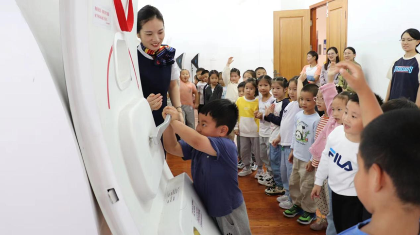 在参观、授课过程中,空中乘务专业教师根据幼儿特点采用生动有趣的问答方式,与小朋友们进行互动,为孩子们介绍了机场的基础构建,如塔台的作用、跑道的使用等,将航空通用知识寓教于乐。在体验中,无论是飞机的内外部构造,还是飞机上应急设备的使用方法,都牢牢抓住了小朋友们的兴趣关注点。